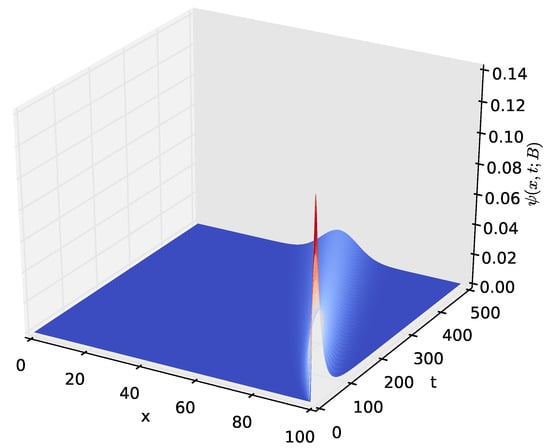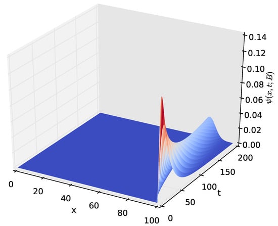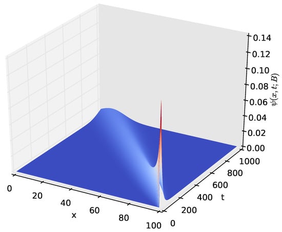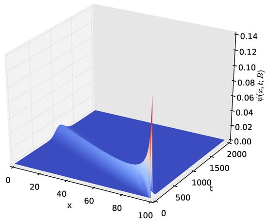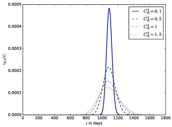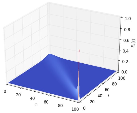 Figure 3 and Figure 4 show the density of the number of energy units n present in the battery at time t. It starts with a sharp spike and then gradually decreases to zero. This is because, initially (at time ), we start with a battery fully charged to its capacity, B. The battery’s energy content gradually decreases with time and eventually reaches zero when all of the energy stored in the battery is completely depleted. As shown in Section 4.2 of this paper, a similar probability density can be obtained by modelling the battery using a diffusion process.