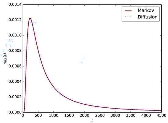 Figure 5 shows the comparison of the probability density of the lifetime of the IoT device given by Equation (18) in the case of Wh and W with the corresponding Markov result in Equation (11). For the diffusion model, we use to ensure that the distribution of the time required to consume a unit of energy is exponentially distributed to compare the Markovian and diffusion approximation models. It can be observed that the distribution of the lifetime of the IoT device obtained using the proposed diffusion model is the same as that obtained using the pure death Markovian model used in References [,] to model the battery of an IoT device.