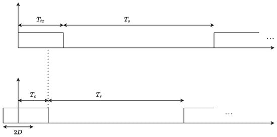During the lifetime of the device, the device can either be in active mode (gathering data from the environment using sensors, manipulating physical systems using actuators, performing lightweight processing, or communicating with other devices or with an access point) or in sleep mode (in a sleep mode the energy consumption of the device is minimum or negligible). The power consumption models considered in this paper are inspired by the model developed in References [,,]. They computed the average power consumption of an IoT device during its lifetime by summing the average power consumption of the device in the active mode and the average power consumption in the sleep mode. They derived the average power consumption in the active mode by calculating the power consumed by each module or component of the device (sensor/actuation modules, microcontroller units, communication units, and other electronic components). Following a similar approach, we derived the average power consumption of an IoT device, taking into consideration the fraction of time that the device spent in the active mode (the duty cycle ratio) [],