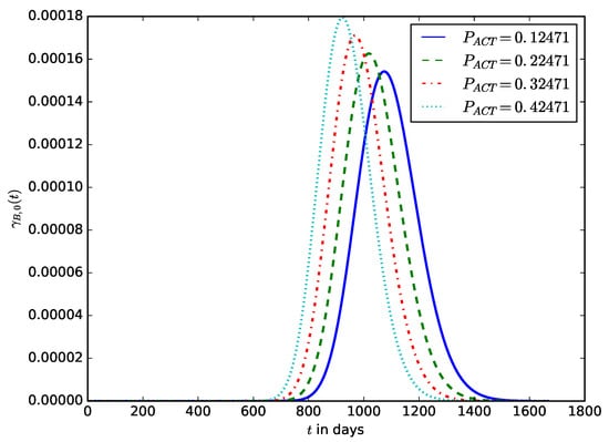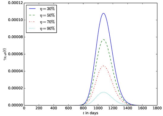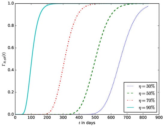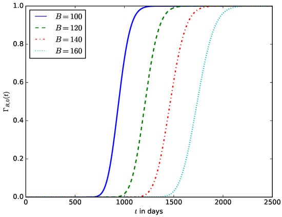 When deploying an IoT device in an IoT network, the probability of the time after the energy stored in the battery should have decreased to a defined percentage () of its initial amount. This enables the operator to estimate the time after the IoT device’s battery should be replaced without waiting until the energy stored in the battery is completely depleted before the battery is replaced. It also ensures that the device is not shut down due to the complete depletion of the energy stored in the battery. Figure 19 shows the influence of the energy threshold percentage on the probability density function, . It is the pdf that after time t, the energy in the battery is ; that is, the battery must have discharged to percent of its initial amount of energy. Figure 20 shows the influence of the energy threshold percentage , probability that after time t, the amount of energy present in the battery is ; that is, the battery must have discharged to percent of its initial amount of energy.