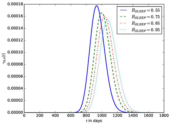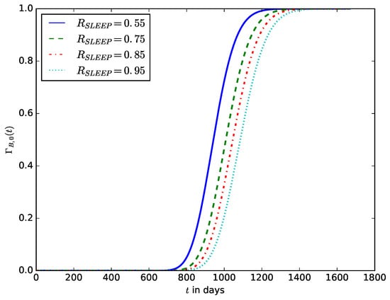 The influence of the proportion of sleep time, , on the distribution of the lifetime of the IoT device.