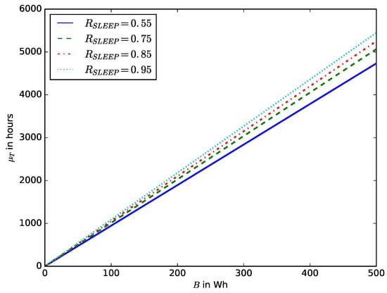 Mean device lifetime versus battery capacity B for various values of sleep mode ratio .