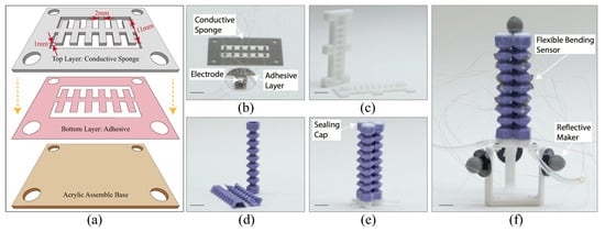 The planar fabrication method has been applied in the sensor fabrication, similar to the methods used in [36,43]. By employing such manufacturing techniques, it is possible to produce the sensors in small batches. The sketches of the planer fabrication process are shown in Figure 2a. Each flexible bending sensor comprises two layers fabricated using planar fabrication methods and cut by a laser cutter. The top layer is made of a 1 mm thin layer and 2 mm wide PU conductive sponge material (Beilong Inc., Wujiang, China) with a constant thickness, while the bottom layer is composed of adhesive (300LSE, 3M, Saint Paul, MI, USA). Copper electrodes with leading wires were attached to the two ends of the sponge using silver conductive adhesives (3703, Sinwei, Shanghai, China) (Figure 2b). After drying at room temperature for 12 h, the sensors were trimmed and the undesired portions were removed. The sensors were then affixed to the actuator body using the aforementioned silicon adhesive (Figure 2f). To fit the finger-sized bellow-shaped actuator, the length, width, and thickness of the flexible bending sensor were selected to be 11 mm, 2 mm, and 1 mm, respectively. The length and width of the flexible bending sensors can be varied by changing the laser cutting pattern to match the dimensions of different soft actuators, while the thickness of the sensors can be adjusted by selecting a conductive sponge sheet with a different thickness. The number of sensors attached to the soft actuator depends on the required level of accuracy. In our design, we bonded nine thin sponge sensors to the actuator body.