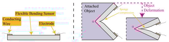 In this study, we utilized commercially available thin conductive sponges as the sensor material, which were attached to the lateral surface of a three-degree-of-freedom (DoF) soft actuator. Previous research has demonstrated that the piezoresistive properties of thin conductive sponges enable the detection of deformation and tactile information of attached objects [22,27,28,29,30,31,32,33]. Due to their flexible and lightweight nature, sensors developed with sponge materials have been widely employed in human–robot interactions, including tactile sensing [22,27,29,30] and human motion detection [28]. The porous and flexible nature of the conductive sponge structure minimizes impediments to the movement of attached objects induced by sensor deformation.