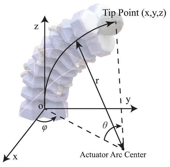 In our case, we can directly measure the coordinates of the tip point and the rear point in the task space of the actuator. To transfer these coordinates to the configuration space, some manipulations are required. We set as the origin, and then can be calculated based on the tangent values of and if the projection of the actuator on the plane does not lie on the primary axis.