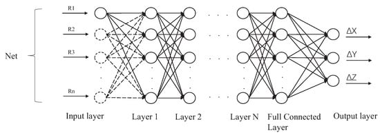 The neural network architecture comprises an input layer, a fully connected layer, and an output layer, with the number of hidden layers ranging from one to four (validation results with different numbers of hidden layers are compared in Figure 5). Dropout layers follow the hidden layers to prevent overfitting. The inputs consist of a time-series sensing signal feedback from each sensor (R1, R2, R3…R9), and the output represents the absolute spatial position (x, y, z). The LSTM neural network’s structure is illustrated in Figure 6. The use of dropout layers helps to prevent overfitting. Furthermore, fine-tuning hyperparameters such as the number of hidden layers, number of hidden states, and dropout layer rate is critical to achieving optimal performance, which is compared and determined in Section 4.2. The overall root mean square error (RMSE) is selected as the cost function to evaluate the performance of the trained LSTM neural network, representing its ability to perceive the 3D dynamic posture of the bellow-shaped FEA in the presence of non-linear and hysteretic sensor feedback response. The MATLAB Deep Learning Toolbox is utilized to train and test the LSTM neural network, as detailed in Section 3.2.