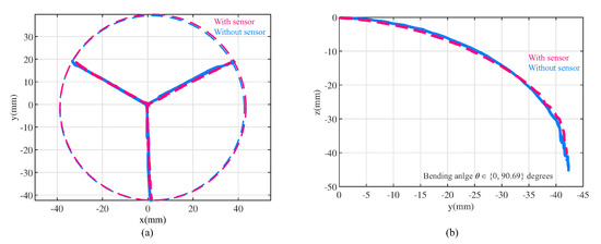 Working space of bellow−shaped actuator with (red curve) and without (blue curve) sponge bending sensor. (a) Top view of working space. (b) Side view of working space. The bending angle of the actuator could vary between 0 and 90.69 degrees. This shows that the thin sponge sensor has negligible influence on the soft actuator’s motion.