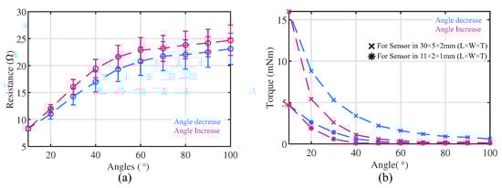 Experimental results of flexible bending sensor in (a) electrical resistance response test and (b) sensor torque response test. The responses of sensors when the bending angle decreased and increased are indicated by the blue line and red line, respectively.