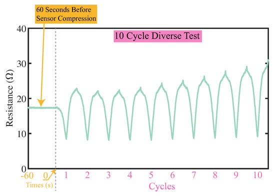 Diverse test results. Resistance of sensor during the 10−cycle diverse test together with 60 s data before test are presented to indicate sensor responses.