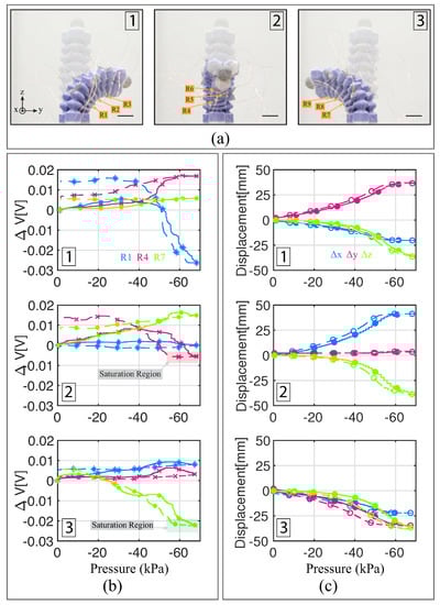 As discussed in Section 3.2, the response of the flexible bending sensor when attached to soft pneumatic actuators was recorded, and the resulting voltage changes were plotted in Figure 10. Sensors #1–3, #4–6, and #7–9 were attached to the same bellow side wall from bottom to top, as shown in Figure 10a, resulting in similar responses of the three sensors with respect to actuator shape-changing. In this experiment, we determined the saturation region of the thin sponge bending sensor. When the air pressure was lower than −50 kPa, the voltage change due to actuator deformation was small and smooth (Figure 10b). Beyond this range, the sensor output saturated as the sponge edges fully contacted each other. This phenomenon is further discussed in Section 4.3.