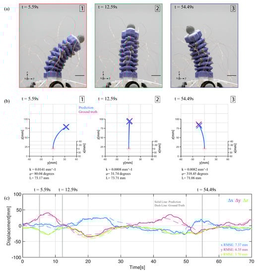 Validation results on random actuator motions. (a) Photos with time step. (b) Respective 3D representations of postures of the soft actuator. Kinematic parameters k, , and L are shown in the figure. In (b), the blue curve represents predictive posture; the red curve represents ground truth. (c) Plots of ground truth (dashed lines) and predictive displacement in the x−axis direction (blue curve), y−axis direction (red curve), and z−axis direction (green curve) of the reference frame. Dashed lines are representing ground truth. Time steps in (a,b) are represented by a gray shaded vertical bar (scale bar = 1 cm. The perspectives of (b) are top−down view along the x − z plane, parallel to the vector (3, 0, 1)). Actuator motions in (c) are included in Video S1.
