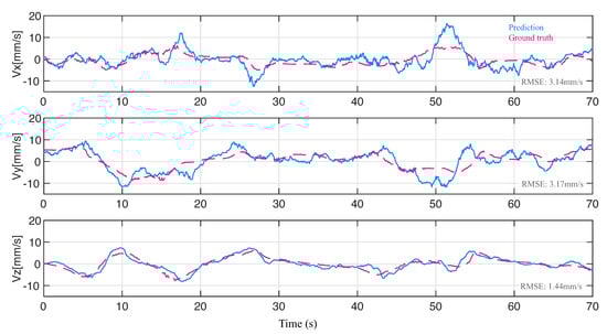 Velocity prediction of actuator tip for validation results in Figure 11c. From top to bottom, velocity in the prime axis direction of the reference frame was represented. Blue curves represent predictive velocity; red dash lines represent ground truth.