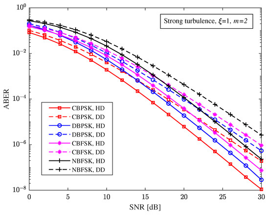 With CBPSK modulation and , Figure 4 shows the relationship between the ABER and the SNR of the hybrid direct link under different turbulence intensity, detection schemes, and RF fading parameters. It can be seen from Figure 3 that the RF fading parameter has a greater impact on the ABER performance of the hybrid FSO/RF direct link. When this increases, the ABER of the system increases. For example, with a 20 dB SNR and moderate turbulence, the ABERs of the hybrid direct link with and under heterodyne detection are and , respectively, and the ABERs of the hybrid direct link with and under direct detection are and , respectively.