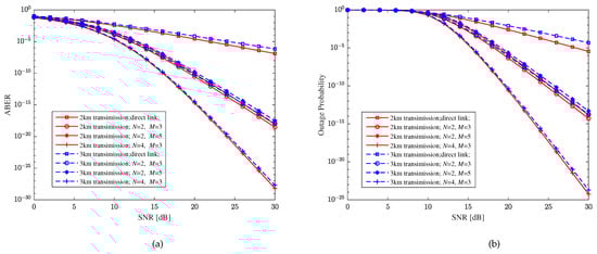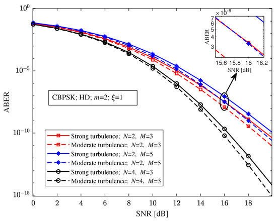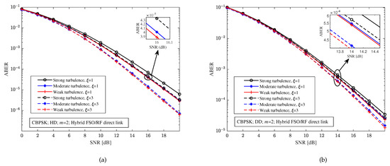With CBPSK modulation and the fading parameter , Figure 3 depicts the relationship between the ABER and the SNR of the hybrid FSO/RF direct link under different turbulence intensity, detection schemes, and pointing errors. Comparing Figure 3a,b, it is easy to find that the ABER of the hybrid FSO/RF direct link with the heterodyne detection scheme is better than that of the direct detection scheme for any turbulence intensity and pointing errors. For example, for any turbulence intensity and pointing errors, the ABER of the hybrid direct link with the heterodyne detection is lower than when the SNR is 20 dB in Figure 3a, and the ABER of the hybrid direct link with the direct detection is higher than in Figure 3b. Although compared with only the FSO link, the performance of the hybrid FSO/RF link has been greatly improved, it can be seen from Figure 3 that the turbulence intensity and the pointing errors still have a significant impact on the ABER of the hybrid direct link. For example, in Figure 3a, with the heterodyne detection and 16 dB SNR, the ABERs of the hybrid direct link with the pointing errors parameter and under moderate turbulence are and , respectively, and the ABERs of the hybrid direct link with the pointing errors parameter and under weak turbulence are and , respectively.