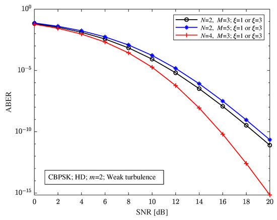 Under different turbulence conditions, pointing errors, RF fading parameters, modulation modes, detection schemes, and relay-aided structures, the performance of the hybrid FSO/RF direct link and the relay-aided hybrid system is numerically analyzed. By calculating the approximate value of the generalized Gauss–Laguerre quadrature function with , the ABER of the relay-aided hybrid system can be obtained according to Equation (19). To simplify the simulation analysis, it is assumed in this section that the atmospheric turbulence intensity is consistent for all FSO links in the relay-aided system (but the atmospheric scintillation index also varies depending on the transmission distance), and the fading parameters of all RF links are also the same. The structure parameters (, ), (, ), and (, ) have been selected to avoid entanglement. According to the meaning of the scintillation index, the turbulence parameters set for the 1 km FSO link under the Málaga turbulence are selected as , , and , respectively, for weak, moderate, and strong turbulence conditions. For weak turbulence, the parameters of the Málaga turbulence are and , respectively, for 2 km and 3 km FSO links. Other parameters for the Málaga turbulence include , , and .