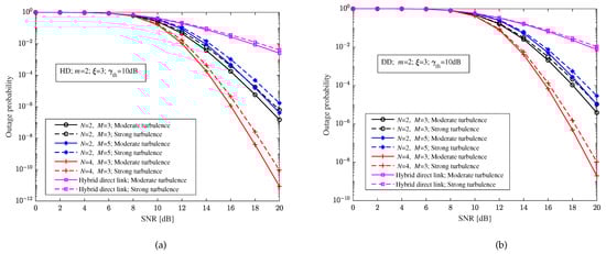 When the pointing errors parameter , the RF fading parameter , and the decision threshold dB, Figure 7 shows the relationship between the outage probability and the SNR of the relay-aided hybrid FSO/RF system and hybrid direct link with heterodyne detection and direct detection, respectively. According to Figure 7, it is easy to see that compared with the hybrid direct link, the relay-aided hybrid system can significantly improve the outage performance. In Figure 7, we can also see that a different turbulence intensity still has a certain impact on the relay-aided hybrid FSO/RF system. Different structures of the relay-aided hybrid system have different effects on the outage performance of the system, that is, the outage probability of the system will increase with the increase in hops and decrease with the increase in paths. Comparing Figure 7a,b, it can be seen that the outage probability of the relay-aided hybrid system and the hybrid direct link with heterodyne detection is better than that with direct detection.