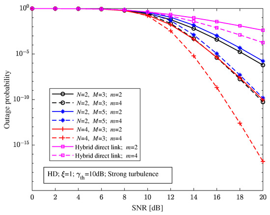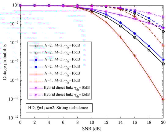 When the pointing errors parameter , decision threshold dB, and with strong turbulence, Figure 8 shows the relationship between the outage probability and the SNR of the relay-aided hybrid system with different structures and the hybrid direct link under different RF fading parameters. It can be seen from Figure 8 that the relay-aided hybrid system can effectively improve the outage performance compared with the hybrid direct link with different RF fading parameters m. The outage probability of the relay-aided hybrid FSO/RF system and the hybrid direct link will decrease with the increase in m.
