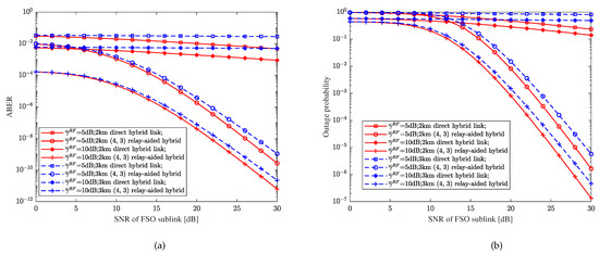 Assume that the average SNR of each bit in the FSO and RF sub-links is unequal, that is, , the distance of each hop is 1 km and the direct link is 2 or 3 km. With weak turbulence, CBPSK modulation, heterodyne detection, the RF fading parameter , the pointing errors parameter , and the decision threshold dB, Figure 11 shows the relationship between the performance metrics and the SNR of the relay-aided hybrid FSO/RF system under different direct distances, the SNR of the RF sub-link, and relay-aided structures. From Figure 11, it can be clearly seen that the changes in the SNR of the RF sub-links have a significant impact on the systems of hybrid direct links and relay-aided hybrid systems. Further, compared with Figure 10, we can find that the performance of the hybrid direct link and the relay-aided hybrid system with different transmission distances under the same conditions is significantly different after the SNR of the RF sub-link changes.