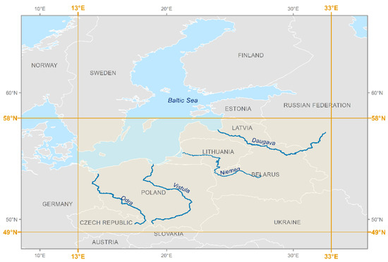 Due to the above, the selected area of interest was the southern and southeastern part of the Baltic Sea catchment. Special attention was paid to the main rivers, which include two rivers of a longitudinal course (Vistula and Odra Rivers) and two latitudinal rivers (Niemen and Daugava). The areas adjacent to their estuaries belong to the most polluted parts of the Baltic Sea [28]. The linear nature of watercourses poses a challenge for satellite monitoring, which is better adapted to providing images of point targets. For the purposes of further analyses, the focus area was defined for the planned satellite mission. The area is contained between the following coordinates: 13° E–33° E and 49° N–58° N, and the main rivers with 2 km wide buffer zones whose axes are consistent with the streamline (Figure 2).