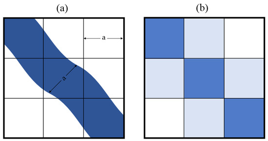 The problem of averaging the value of the pixel: (a) river whose width equals one times the GSD; (b) expected representation of the river in the image.