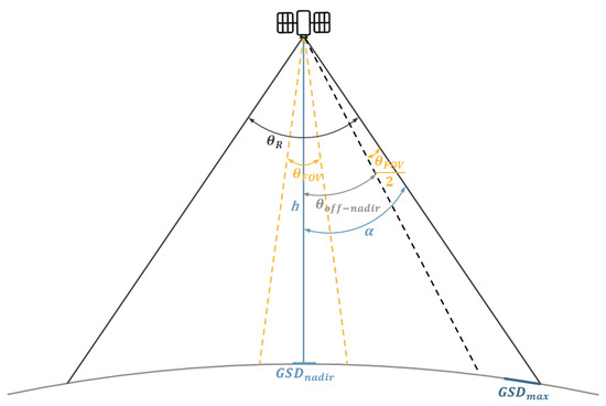 The highest GSD will occur at the maximum possible deflection of the optical axis from nadir. The adopted value should be the minimum resolution required for the mission, which will occur for angle (2). The value of the angle consists of and resulting from the sensor and satellite platform used (3). Using trigonometric equations, reducing do allows us to calculate the altitude of orbit h after transformation (5).