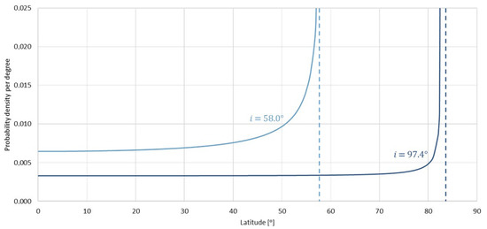 The density of the probability distribution of coverage of random latitude per degree is presented in Figure 8. It is assumed that for the inclination of 58.0°, the ground track of the satellite crosses latitudes that are slightly smaller than the orbit inclination with the highest probability. Additionally, in comparison to the heliosynchronous orbit, the probability density for the area of interest (49°–58°) is much higher—approx. 2 times—and tends towards infinity for the upper limit.