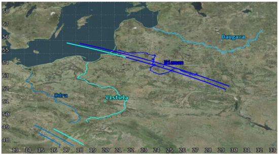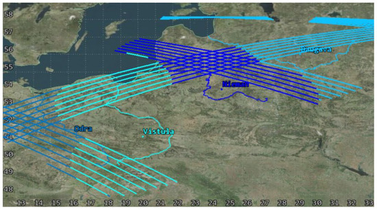 The analysis was complemented by verifying the accessibility of imaging any section of each of the rivers with use of FOR in 3-day periods. The simulation took lighting into account by defining the minimum angle of elevation of the Sun of 10° for each point of the river. These results are presented in Table 6 and in Figure 16. During periods of access by only one satellite (1–3 July 2023, 29–31 July 2023), the constellation does not provide 100% coverage, particularly for the Vistula River, for which access was achieved, respectively, to 44.86% and 9.03% of its length. In the second analysed period, only 21.94% coverage was achieved for Odra and 74.08% for Daugava. During the effective flights of two satellites (15–17 July 2023), the Niemen River was not fully covered; access to 87.64% of its area was achieved. As a result, it is worth considering designing a larger constellation.