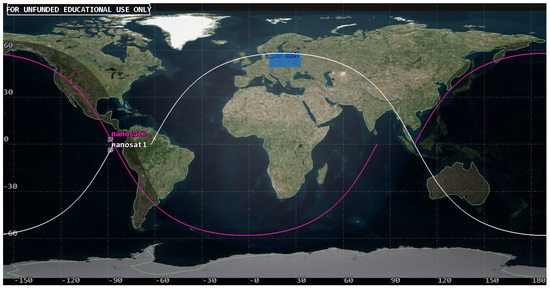 Based on the analysis of coverage for a single satellite and the criterion of maintaining low mission costs, the authors considered a set consisting of two platforms. Walker’s concept was used in the design, and it was assumed that the first satellite would be placed on the orbit discussed in the previous sub-section. The second satellite was placed on an orbital plane of the identical shape and size but displaced in rectascence (Ω) by 180° and, in the initial position, denoted by the true anomaly (TA) of 180°. As a result, the Project 1 symmetric constellation of the parameters 58°: 2/2/1 was created (Figure 14).