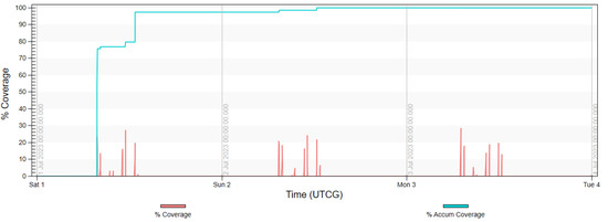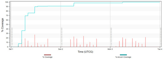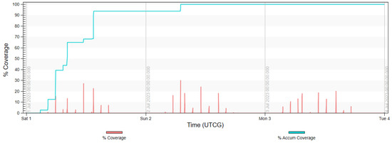 The final analysis, presented in diagrams in Figure 17, Figure 18, Figure 19 and Figure 20 shows the imaging access for constellations and the percentage of coverage of all rivers that was achieved at the given moment. It is noted that for Project 4, the access was evenly distributed throughout the day, similarly to in Projects 2 and 5. Due to the influence of weather conditions, such a situation is more desirable than the accumulated access that was observed in Project 3.