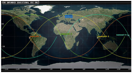 Presentation of the positioning of nanosatellites in Project 4 constellation and the area of interest (AOI).