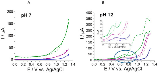 SWVs registered for 0.5 mM methamphetamine prepared with 20 mM PBS of pH 7 (A) and 20 mM PBS of pH 12 (B) on different types of electrodes: graphite-based screen-printed electrodes (solid blue), graphite-based screen-printed electrodes modified with GPH (solid green), and graphite-based screen-printed electrodes modified with MWCNTs (solid purple). The dashed lines correspond to the blank tests recorded on each type of electrode in the absence of methamphetamine. The graph inserted in Figure (B) represents detail for the part of the voltammogram where the electrochemical oxidation signal of methamphetamine is observed. (Experimental parameters for SWV tests: potential window from 0 to 1.3 V, step potential of 5 mV, scan rate of 100 mV/s, amplitude of 25 mV, and a frequency of 10 Hz).