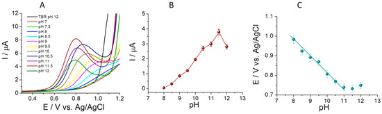 The influence of pH on the behavior of a 100 μM MAP solution was tested using SWV in the pH range of 7 to 12 (Figure 3A). The highest signal intensity was observed at a very alkaline pH, as expected, which agrees with the structure of the compound and with other literature data. The effect of pH on the oxidation peak current intensity (Iox) of MAP was also studied using 100 μM solutions of the drug in the pH range from 7 to 12, prepared with BR buffer (Figure 3B).