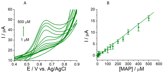 In the development of the electroanalytical methodology, the optimization of SWV experimental parameters represents a crucial step. Thus, for the quantification of MAP, the following parameters were optimized: step potential, scan rate, amplitude, and frequency to determine the optimal experimental setup. Experiments were performed on the GPH platform in the presence of 0.5 mM of MAP prepared in PBS pH 12. One parameter was varied while the others were kept constant. The most suitable SWV parameters obtained for MAP detection were a step potential of 5 mV, a scan rate of 100 mV/s, an amplitude of 25 mV, and a frequency of 10 Hz. The optimized procedure was applied to assess the dependence between the analytical signal and its concentration and to draw the calibration curve. Analytical parameters were determined from the obtained SWV curves after spiking the buffer solution (in our case, a 20 mM PBS solution of pH 12) with known volumes of the MAP standard solution. A linear increase in the oxidation current of MAP with the concentration was obtained in the range from 1 to 500 μM. Overlaid voltammograms for all tested concentrations are shown in Figure 5A, while the calibration curve is shown in Figure 5B. The points plotted in the calibration curve represent the mean of at least three tests for each concentration, and the error bars represent the standard deviation calculated for each point. The equation that characterizes the dependence between the recorded current and the MAP concentration is Iox (μA) = 0.031 ± 0.1 × [MAP (μM)] − 0.076 ± 0.22, with a correlation coefficient of R2 = 0.9925 and an average relative standard deviation (RSD) of 3.48% over the entire concentration range tested. A LOD of 300 nM was estimated based on the signal-to-noise ratio of 3 (S/n = 3), a LOQ of 1 μM was estimated based on S/n = 10, and the sensitivity was 30.6 nA nM−1.
