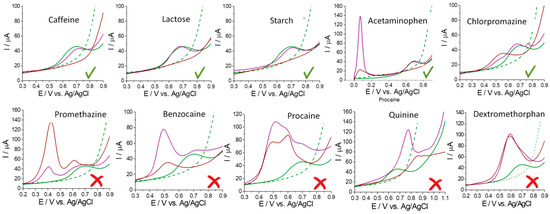 The evaluation of the electrochemical behavior of some adulterants was performed on the optimized sensor platform, found alone in solution or in the presence of MAP. Several 1:1 mixtures of MAP with some of the most commonly reported adulterants or cutting agents for this illicit drug were tested. The obtained results are presented in Figure 6.