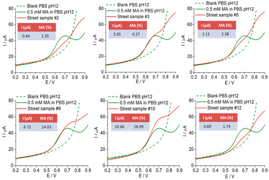 - Street seized samples: a solution of about 0.3 mg/mL of the suspicious confiscated powders (12 seized samples) was prepared in PBS pH 12. The mixture was thoroughly mixed for 30 s before being used for testing. Thereafter, a 100 uL drop was deposited on the screen-printed electrodes for the electrochemical interrogation. The street samples prepared as mentioned were tested without any other pre-treatment.