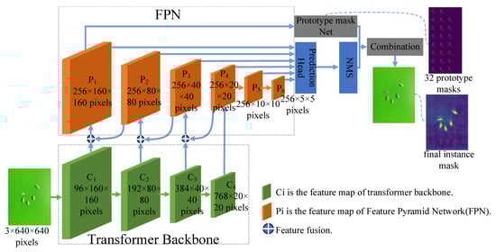 The overall architecture of SY-net, shown in Figure 1, consists of six parts; namely, a transformer backbone, a feature pyramid network (FPN), a prediction head, a prototype mask net, a nonmaximum suppression (NMS) mechanism and a combination module. The transformer backbone is the feature extractor module, and the FPN is the feature pyramid fusion module. The prediction head and prototype mask network are the prediction head module and the prototype mask generation module, respectively, both of which are composed of fully convolutional modules. C1, C2, C3 and C4 are the feature map outputs of the transformer backbone at four stages (stages one to four), with sizes of 96 × 160 × 160 pixels, 192 × 80 × 80 pixels, 384 × 40 × 40 pixels and 768 × 20 × 20 pixels, respectively. P1–P6 are the feature map outputs of the FPN at six stages, and P4 comes from C4 and is downsampled to generate P5 and P6. P4 is upsampled and fused with C3 (this is the ⊕ operation in the figure, representing the feature fusion operation) to generate P3, P3 is upsampled and fused with C2 to generate P2 and P2 is upsampled and fused with C1 to generate P1. The sizes of P1–P6, which are the input feature maps of the prediction head, are 256 × 160 × 160 pixels, 256 × 80 × 80 pixels, 256 × 40 × 40 pixels, 256 × 20 × 20 pixels, 256 × 10 × 10 pixels and 256 × 5 × 5 pixels, and P1 is the input feature map of the prototype mask network. The prediction head outputs the prediction value, and the prototype mask network outputs the prototype mask. The NMS [] module filters the predicted values generated by the prediction head. The combination module combines the outputs of the prediction head and prototype mask network in a linear manner to generate the final instance mask. Figure 1 shows the 32 prototype masks generated by the prototype mask generation network and the mask for the final instance obtained after the combination module.