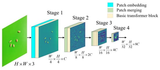 The physical features of rice seeds are similar, and their details are not obvious. It is difficult for existing feature extractors to focus on the key features of rice seeds. In this study, a feature extractor was built by using the transformer architecture. The learning of the physical features of small targets such as rice seeds can be enhanced through an attention mechanism, and the detailed process of extracting features from small targets can be improved from different angles. The network structure diagram for feature extraction is the transformer backbone, as shown in Figure 3. In this figure, the transformer backbone consists of three large modules; namely, a patch embedding module (bright cyan cuboid), a patch merging module (light green cuboid) and a basic transformer block (light yellow cuboid). Stages 1–4 correspond to C1–C4 in Figure 1, respectively.
