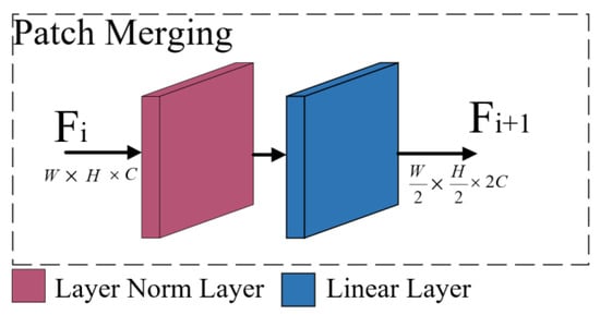 The patch merging module (light green cuboid in Figure 3) is used to adjust the widths, heights and numbers of channels for the input feature maps at different stages. Patch merging downsamples the input feature maps by a factor of 2, and the number of output channels is double the number of input channels.