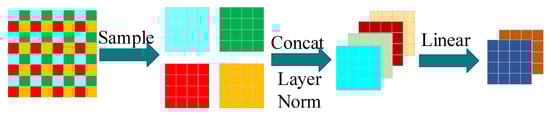 In Figure 7, a feature map 8 × 8 pixels in size is used as an example. First, the feature map is sampled at equal intervals (the sampling interval is 2) to generate four feature maps 4 × 4 pixels in size. Then, the four generated feature maps are connected in the depth direction. Next, layer normalization processing is performed, and linear mapping is executed by the linear layer to generate two feature maps with dimensions of 4 × 4 pixels as the output feature maps.