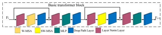 The basic transformer block (light yellow cuboid in Figure 3) is used to extract the feature information from the feature map. As shown in Figure 8, the basic transformer block consists of a window multi-head self-attention (W-MSA) mechanism, a shift window multi-head self-attention (SW-MSA) mechanism, a multilayer perceptron (MLP), a path dropping layer and a layer normalization layer. The W-MSA and SW-MSA mechanisms are the core of the basic transformer block.