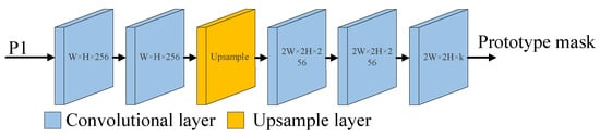 As shown in Figure 10, for the convolution in the fully convolutional network, first, two convolutional layers are used. The number of input channels is 256, the number of output channels is 256, the convolution kernel size is 3 × 3, the stride is 1 and the padding is 1. Then, the height and width of the feature map are doubled through an upsampling layer. The feature map passes through two more convolutional layers (with the same parameters as the previous convolutional layer) and finally passes through a convolutional layer with 256 input channels, k output channels, a kernel size of 1 × 1, a stride of 1 and padding of 0, where k is the number of prototype masks generated. The rectified linear unit (ReLU) activation function is used to activate the prototype mask because it is a nonlinear function that has the advantages of simple operation, fast convergence and not having a saturation region. By using the ReLU function, the inference speed of the network can be accelerated, and the problem of gradient disappearance can be avoided. After a series of convolution and upsampling operations, the width and height of the output feature map will be double those of the input feature map. Performing feature extraction through larger feature maps can produce finer masks and richer semantic information.