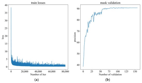 Total loss curve and segmentation precision curve. (a) Total loss curve with the number of iterations. (b) the segmentation precision curve with the number of validations.