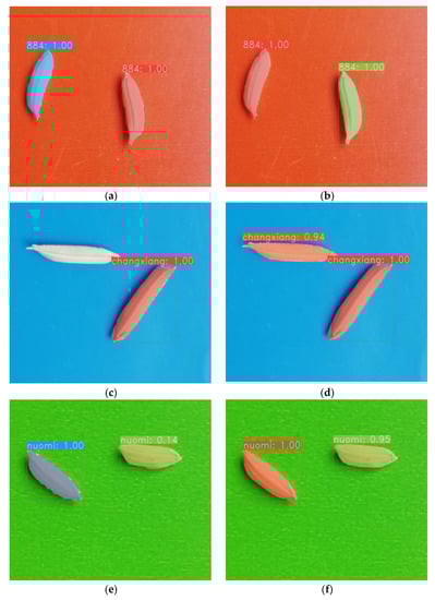 Instance segmentation [] based on deep learning technology [] can quickly and accurately solve complex problems and realize large-scale image data processing, so it has become one of the most popular research directions in the field of computer vision. Instance segmentation is widely used in many fields, such as industry, transportation, remote sensing images and agriculture. For example, in 2022, in the industrial field, Antwi-Bekoe et al. [] established an instance segmentation network for the segmentation of industrial insulator defects by using the interactions of cross-latitude information, and the segmentation accuracy achieved for insulator defects reached 89.4%. In the field of transportation, de Carvalho et al. [] generated a vehicle dataset via semisupervised iterative learning and proposed a spear box-free instance segmentation method, which achieved 90% accuracy with the generated dataset. In 2023, Chen et al. [] proposed a large-scale building extraction framework in the field of remote sensing images based on super-resolution and instance segmentation to perform instance segmentation for large-scale buildings in cities, and the building segmentation accuracy achieved for satellite images reached 84%. In the agricultural field, Borrenpohl et al. [] used instance segmentation techniques to segment cherry trees and their dormant fruits through images with active illumination and natural illumination, and the image segmentation accuracy of this approach reached 94%. The applications of instance segmentation in various fields have significant advantages, including low costs, high speeds, high accuracy rates and the capacity for large-scale intelligent quality inspection. Despite the above advantages of instance segmentation, however, a rice seed instance segmentation method has not been reported, mainly because of the similar characteristics, small particles and dense distributions of rice seeds, which make it difficult to accurately detect their quality and segment them.