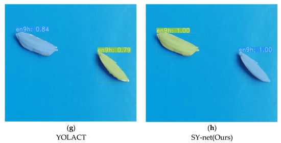 Figure 12a,c,e,g show the segmentation effect of YOLACT, and Figure 12b,d,f,h show the segmentation effect of SY-net. For the same rice seed data, based on the comparison images, it can be seen that SY-net yielded better detection and segmentation effects, and the generated rice seed mask was more detailed and complete. The method described in this paper is more capable of learning the detailed features of rice seeds and has better performance in terms of segmenting the instances of rice seeds.