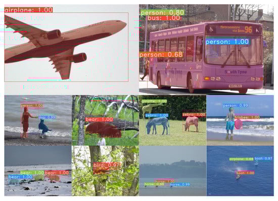 Figure 13 displays the detection and segmentation performance achieved by SY-net with the COCO2017 dataset. The first row shows the segmentation effect with large targets, the second row shows the segmentation effect with medium targets, and the third and fourth rows show the segmentation effect with small targets. Combining Table 4 and Figure 13, it can be seen that SY-net also showed good segmentation with the COCO2017 dataset for targets of different sizes.