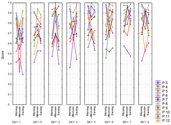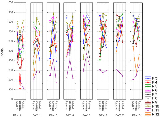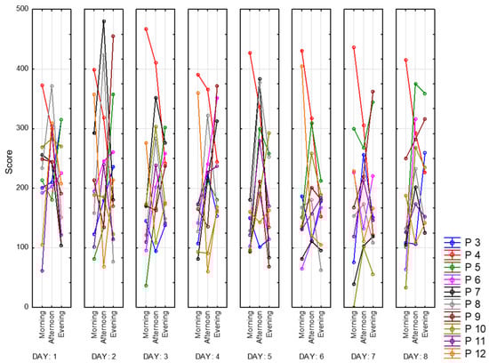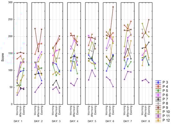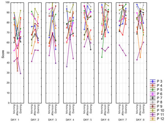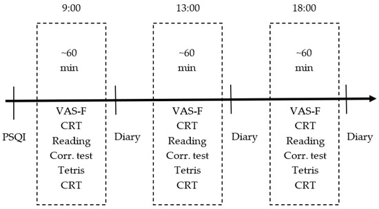 For daily assessment of current state of fatigue (as well as indicators of the quantity and quality of sleep) VAS-Fatigue (VAS-F) and a list of questions about the quality of sleep over the past night were used [37]. The VAS-F scale consists of 18 questions related to the subjective perception of fatigue and is filled in before each entry in the experimental session (3 times a day).