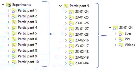Figure 5 shows the structure of the collected dataset of all participants in the “Experiments” folder. This folder contains other folders (experiment content) that include the participant’s id. The name of the participant’s folders contains the date of recording. The “Experiments” folder contains the “Eyes” folder, “PPI” folder, and “Videos” folder, which includes eye tracker data, PPI data, and webcam videos, respectively. There are also files “Metadata” and “Summary”. File “Metadata” includes several sheets reporting results of the CRT task (reaction time, standard deviation, number of errors), results of the correction test (19 parameters), results of the Tetris game (overall score, score, lines, levels, completed game, duration) and parameters of heart rate variability (58 parameters) and results of questionnaires scoring (BDI_II, FAS, PSQI, dominant eye, and hand) and also general information about the participant (age, gender). The file “Summary” includes all this information and quantitative gaze characteristics. Each session has its own CRT task results, correction test “Landolt rings” results, Tetris game results, and HRV indexes.