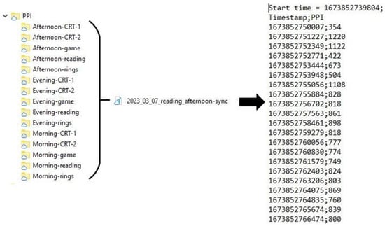 Figure 6 shows the structure of the “Eyes” folder, which contains folders with eye-tracking data information for each session (five records of morning, afternoon, and evening sessions, respectively). Each folder contains a .csv file with gaze coordinates and a .mp4 file with scene footage. The gaze coordinates file contains the gaze fixation timestamp, number of frames, horizontal gaze coordinate, and vertical gaze coordinate.