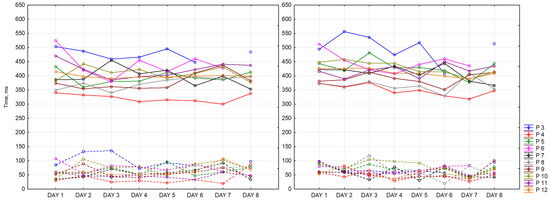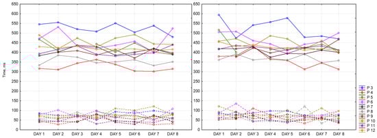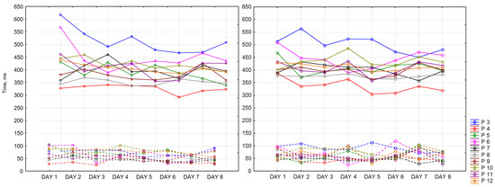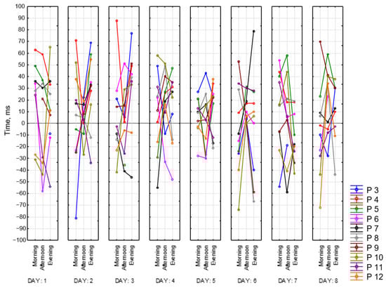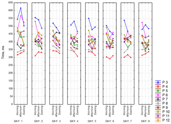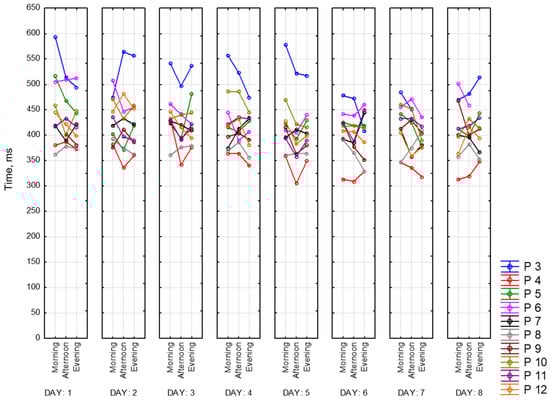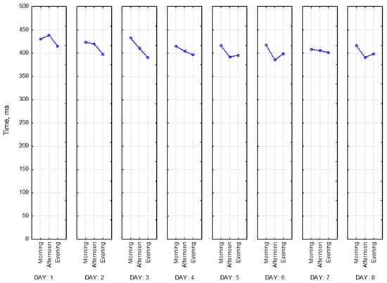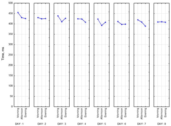 To objectify the data obtained as evidence of a state of fatigue, a choice reaction time (CRT) was recorded. CRT is one of the types of Go/No-Go tasks. It characterizes neurodynamic processes in the central nervous system. Theoretically, by the end of the working day, there is an increase in reaction time of CRT by an average of 30% [25]. To reduce the number of errors, it is proposed to perform CRT measurements repeatedly. It allows us to calculate stability of the reaction based on the standard deviation, which increases with fatigue.