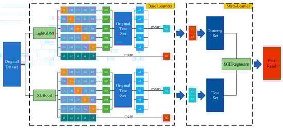 Ensemble learning is an approach to complete a learning task by constructing and combining multiple learners. It first generates a set of base learners and then combines them through some learning strategy to output the final result [46]. Currently, ensemble learning mainly includes homogeneous integration and heterogeneous integration. Bagging [47,48,49] and boosting [44] are the most classical homogeneous integration methods. Homogeneous integration patterns are highly correlated and prone to overfitting where the model over-fits the training dataset. Overfitting can lead to a decrease in the generalization ability of the model to the point where it does not generalize well to new, unseen data. In addition, frequent application of averaging can lead to a homogeneous integration model that simply linearizes the results of the base learner, from which it is difficult to accurately reflect the true diagnostic results. Heterogeneous integration primarily includes stacking [50]. The stacking algorithm is a typical representative of heterogeneous integration methods and consists of two main layers of structure. Layer 1 is the base learner, which is used to train and predict the original samples. Layer 2 is the meta-learner, which is used to combine the diagnosis results of layer 1, to learn again, and perform the diagnosis. The high diversity of heterogeneous integration methods has significant algorithmic advantages, thus outperforming the prediction performance of a single learner [51]. In this study, LightGBM and XGBoost were used as base learners, and SGDRegressor was used as a meta-learner, combined with a 5-fold cross-validation method to train each base learner separately for integration, as shown in Figure 1.